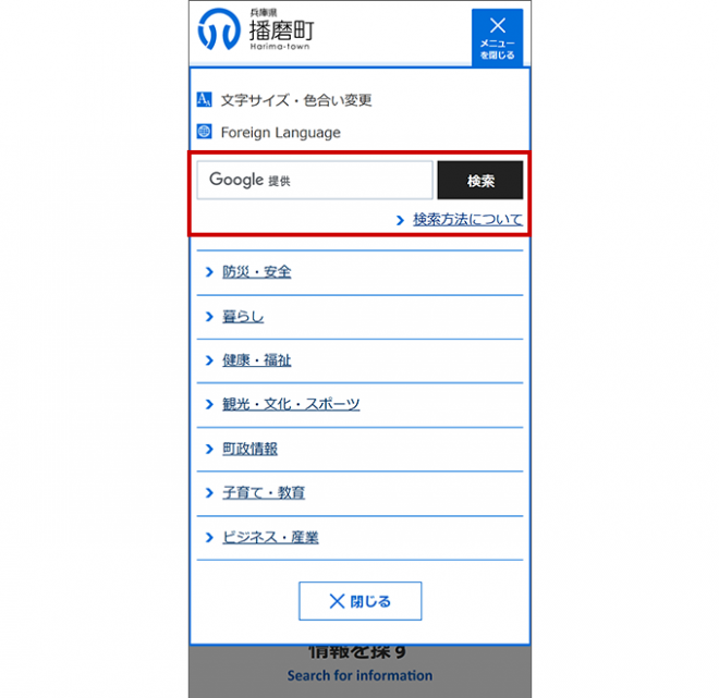 「情報を探す」エリアのほかに、PC版ではヘッダー、スマートフォン版では「メニュー」ボタンから検索が可能です。