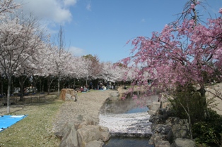 緑道「であいのみち」に隣接し、総面積は約1.5ha。園内には、100種類以上もの花木が植えられ、複合遊具を備えた「ちびっ子広場」のほか、水遊びのできる人工池「はだかの池」や、芝生を敷きつめた広場「はだしの森」などがあります。さらに日本庭園内には、茶会や研修のできる「蓬生庵」があります。