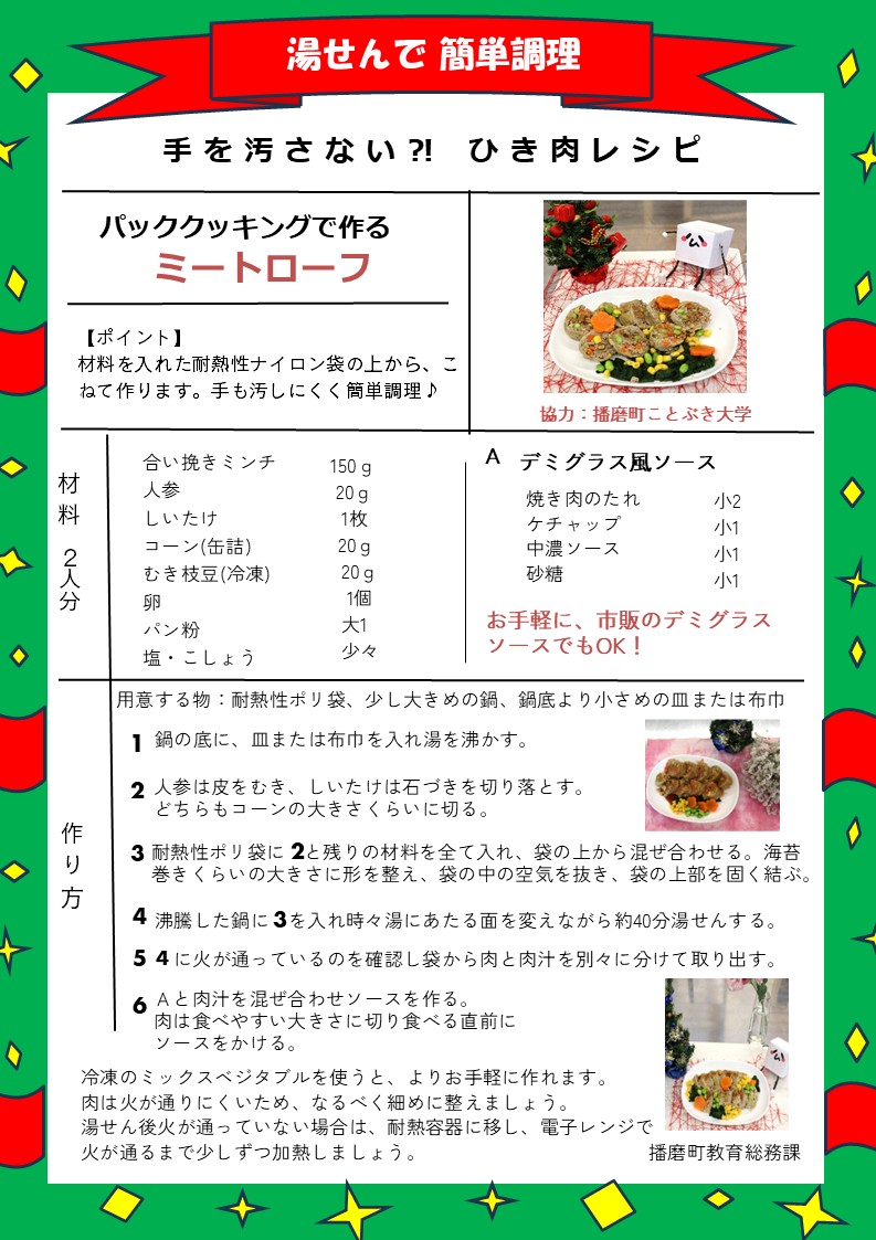10月某日、播磨町ことぶき大学「ちょこっと講座~番外編~」において、湯せんで簡単調理「手を汚さない⁈ひき肉レシピ」として、パッククッキングという調理法で「ミートローフ」を作りました。
